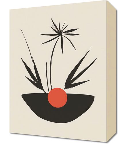 Obraz z serii boho zatytułowany Esencja Wzrostu.Na tej grafice proste, dynamiczne pociągnięcia pędzlem tworzą sylwetki roślin, które wyrastają z ciemnej, poziomej formy. Centralny punkt kompozycji stanowi jaskrawy, czerwony akcent, przypominający zarówno owoc, jak i słońce, które nadaje życie. Całość, osadzona na ciepłym, beżowym tle, stanowi harmonijną kompozycję pełną spokoju i natury. Dzieło będzie pięknym dodatkiem do przestrzeni, gdzie panuje spokój i szukane są proste, lecz wyraziste dekoracje. To minimalistyczne wyobrażenie roślinności doskonale odnajdzie się w nowoczesnych salonach, gabinetach, czy pokojach relaksacyjnych, gdzie może dodać odrobiny organicznego charakteru i wizualnego spokoju.