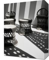 Obraz z serii wnętrza zatytułowany Gra Świateł to stylowa, monochromatyczna fotografia, która oddaje estetykę współczesnego designu. Na fotografii widzimy zestaw eleganckich, plecionych stołków z rattanu ustawionych na tle geometrycznych cieni. Ostre linie cieni przełamują okrągłe kształty mebli, tworząc fascynującą kompozycję pełną kontrastów. Białe siedziska stołków pięknie kontrastują z ciemniejszymi elementami, a gra światła i cienia nadaje scenie trójwymiarowość i teksturę. Obraz ten będzie doskonały dla miłośników minimalistycznych wnętrz, a także dla osób poszukujących elementu dekoracyjnego, który wprowadzi do pomieszczenia nowoczesny i artystyczny akcent. Idealny do nowoczesnych przestrzeni mieszkalnych, biur, kawiarni lub galerii sztuki.