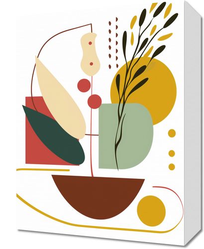 Obraz z serii minimalistyczne zatytułowany Harmonia Natury Martwej. Grafika ta to nowoczesna interpretacja klasycznego motywu natury martwej, gdzie geometryczne formy łączą się z delikatnymi roślinnymi akcentami. Paleta barw jest ciepła i ziemista, z akcentami głębokiego czerwieni, spokojnych zieleni i musztardowych żółci, wszystkie umieszczone na jasnym tle, co nadaje pracy subtelność i lekkość.Ten obraz świetnie komponuje się z wnętrzami, które cenią sobie spokój i równowagę, a także z przestrzeniami, które chcą wnieść do swojego otoczenia sztukę inspirowaną naturą. Może być wyjątkowym dodatkiem do salonu, przestrzeni relaksacyjnej, czy jako estetyczny akcent w jadalni.