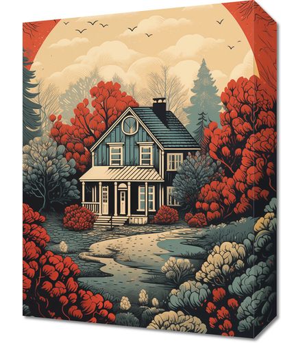 Obraz z serii wnętrza zatytułowany Idylla Rustykalna. Ten ciepły i urokliwy obraz przedstawia sielski dom otoczony przez bujny krajobraz w odcieniach czerwieni i pomarańczy, których intensywność podkreśla zachodzące słońce w tle. Kompozycja łączy w sobie elementy klasycznego amerykańskiego krajobrazu z nostalgicznym uczuciem, które przywodzi na myśl długie, leniwe popołudnia na wsi. Ilustracja ta idealnie nadaje się do nadania charakteru i ciepła każdemu wnętrzu, doskonale pasując do przestrzeni mieszkalnych, kawiarni lub pensjonatów, które chcą zaakcentować swoje powiązania z naturą i wiejskim spokojem.