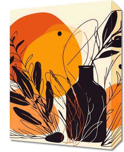 Obraz z serii minimalistyczne zatytułowany Jaskrawy Zachód. Na grafice widnieje silnie stylizowany motyw roślinny, gdzie czarne sylwetki roślin kontrastują z jaskrawo pomarańczowym i żółtym tłem, przypominającym zachodzące słońce. W tle pojawiają się delikatne, abstrakcyjne linie i kształty, dodające kompozycji głębi i tekstury.Ten plakat doskonale wpasuje się w wnętrza ożywione roślinnością, zarówno te domowe, jak i komercyjne przestrzenie typu kawiarnie lub sklepy z roślinami. Jego ciepłe barwy będą wprowadzać przytulną atmosferę i mogą stanowić żywy akcent w przestrzeniach utrzymanych w naturalnej kolorystyce.