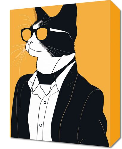 Obraz z serii abstrakcja zatytułowany Jegomość to stylizowany portret kota w ludzkim ubiorze. Charakterystyczne, czarno-białe ubarwienie kota zostało podkreślone przez elegancki, czarny garnitur z białą koszulą oraz modnymi, żółtymi okularami, które dodają postaci wyrafinowanego uroku. Tło w intensywnym odcieniu musztardy idealnie komponuje się z całością, nadając plakatowi ciepły i wyrazisty charakter. Silny profil kota, wyraźne linie i minimalistyczne podejście do szczegółów czynią ten obraz zarówno zabawnym, jak i eleganckim, idealnym do przestrzeni, które cenią sobie humor i styl, takich jak nowoczesne biura, domowe biblioteki czy saloniki.