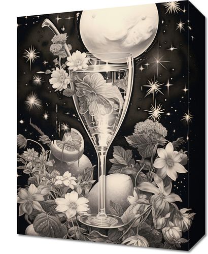 Obraz z serii wnętrza zatytułowany Kosmiczny Eliksir. Niesamowita kompozycja przedstawiająca kieliszek, z którego wylewa się galaktyczny nektar, otoczony kwiatami i roślinami w monochromatycznych barwach. Centralnym punktem jest lśniąca pełnia księżyca, której blask odbija się w szkle, tworząc atmosferę tajemnicy i magii. Gwiazdy migoczą w tle, nadając całości głębokiego, nieskończonego wymiaru. Delikatne linie i szczegóły graficzne wzbogacają kompozycję, czyniąc ją idealnym wyborem do nowoczesnych salonów, galerii sztuki oraz miejsc o tematyce astronomicznej.