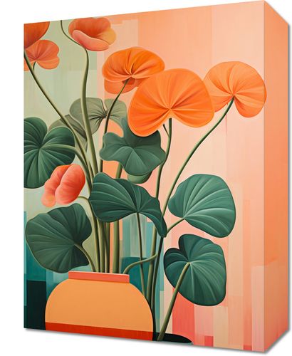 Obraz z serii natura zatytułowany Kwiatowa Harmonia. Delikatne anturium w odcieniach korali wyrasta z oranżowej doniczki, kontrastując z ciemnozielonymi, bujnymi liśćmi. Tło w pastelowych tonacjach różu i zieleni dodaje lekkości i świeżości kompozycji. Delikatność i elegancja ukazanych kwiatów niosą ze sobą uczucie spokoju i relaksu. Świetnie sprawdzi się w jasnych salonach, przestrzeniach wellness oraz kawiarniach o nastrojowej atmosferze.