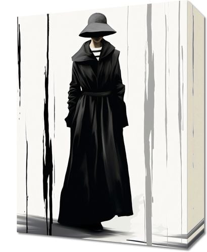 Obraz z serii wnętrza zatytułowany Mroczna Taina. Enigmatyczna postać w czarnym płaszczu i szerokim kapeluszu ukrywa swoją tożsamość, podkreślając aura tajemniczości. Czarno-białe tło z pionowymi smugami przypominającymi deszcz lub płynący atrament dodaje głębi i dramatyzmu kompozycji. Subtelne niuanse światła i cienia grają na powierzchni płaszcza, tworząc atmosferę intrygi i nieokreślonego niebezpieczeństwa. Świetnie sprawdzi się w nowoczesnych galeriach sztuki, luksusowych hotelach o minimalistycznym designie oraz w przestrzeniach przeznaczonych dla miłośników noir i kryminałów.