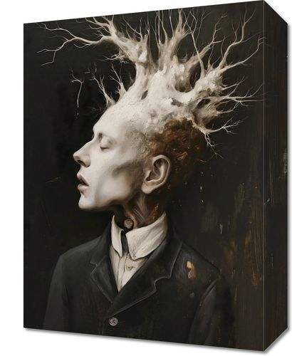 Obraz z serii abstrakcja zatytułowany Myśli Wzrastające prezentuje surrealistyczny portret mężczyzny, z którego głowy wyłania się skomplikowana struktura przypominająca korzenie lub gałęzie drzewa. Ten organiczny koronament wyrasta z myśli postaci, symbolizując rozwój, kreatywność i złożoność ludzkiego umysłu. Kontrast między żywą bielą i szarościami struktury a głębokim, ciemnym tłem sugeruje głębię i intensywność wewnętrznego świata postaci. Ten obraz może stanowić mocny wizualny akcent w przestrzeniach takich jak galerie, artystyczne pracownie, gabinety psychologiczne, a także we wnętrzach osób ceniących głębokie, filozoficzne refleksje.