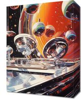 Obraz z serii pop art zatytułowany Orkiestra Sfer. Przedstawia futurystyczną symfonię kosmicznych stacji i satelitów, które unoszą się w przestrzeni wśród majestatycznych planet i wszechogarniających gwiazd. Bogate w detale, błyszczące konstrukcje odbijają się w lustrzanych powierzchniach, tworząc hipnotyzujące wzory świetlne, które przenoszą widza w odległy wymiar. Dynamiczna perspektywa i żywe kolory sprawiają, że obraz jest prawdziwym świadectwem ludzkiej wyobraźni i dążenia do odkrywania nieznanego. To dzieło doskonale nadaje się do nowoczesnych przestrzeni takich jak biura technologicznych firm, centra nauki, a także jako inspirujący element dla domowych biur i pokojów zabaw.