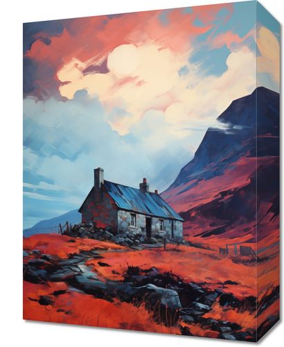 Obraz z serii pejzaże zatytułowany Ostatni Bastion. Obraz przedstawia osamotniony domek umiejscowiony w surowym, ale majestatycznym krajobrazie, pod dramatycznym niebem o intensywnych odcieniach czerwieni i błękitu. Zmierzch słońca rzuca ciepłe światło na dzikie, wrzosowe pola, tworząc kontrast z chłodnymi tonami górskiego tła. Ten obraz wyraża surowe piękno i niezłomność natury, a także ludzką tęsknotę za prostotą i ciszą. Idealnie nadaje się do wnętrz, które pragną wprowadzić poczucie spokoju, odosobnienia i kontemplacji natury.