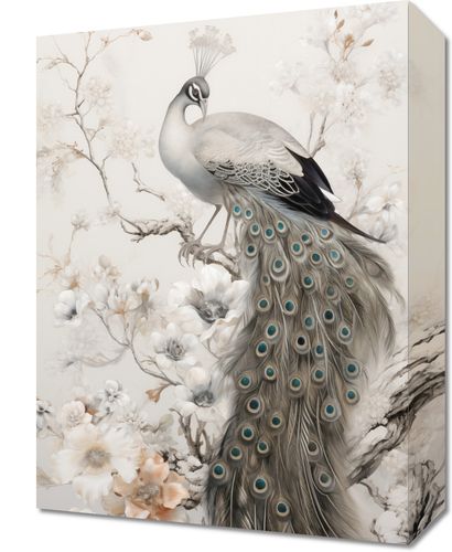Obraz z serii wnętrza zatytułowany Pawia Gracja. Ta grafika przedstawia majestatycznego pawia spoczywającego na gałęzi, otoczonego przez delikatne kwiaty magnolii. Kunsztownie oddane detale piór i kwiatów w pastelowej palecie barw tworzą uczucie spokoju i harmonii. Obraz ten jest idealny dla miłośników piękna natury i sztuki, doskonale nadaje się do wnętrz o klasycznej i eleganckiej estetyce, takich jak salon, sypialnia, a także jako wyjątkowy element dekoracyjny w spa lub miejscach relaksacji.