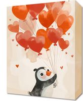Obraz z serii wnętrza zatytułowany Pingwinek z Balonami przedstawia uroczego pingwina trzymającego sznurki czerwonych balonów w kształcie serc, które unoszą się tworząc radosną atmosferę. Subtelne serduszka zdobią również tło, nadając ilustracji miłościwej i ciepłej aurze. Kolorystyka obrazu, z dominującymi ciepłymi odcieniami czerwieni i pomarańczy na kremowym tle, wywołuje uczucie radości i miłości. To dzieło sztuki idealnie sprawdzi się jako dekoracja w przestrzeniach, które mają na celu inspirować pozytywnymi emocjami, takich jak pokoje dziecięce, przedszkola, czy też jako prezent na Walentynki czy inną romantyczną okazję.