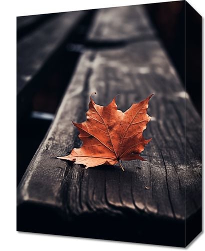 Obraz z serii natura zatytułowany Pojedynczy Liść. Ten obraz przedstawia pojedynczy, jasnobrązowy liść klonu, spoczywający na ciemnym, drewnianym tle ławki parkowej. Głębokie, nasycone kolory i wyraźny kontrast między liściem a ciemnym tłem, wywołują uczucie intymności i refleksji. Idealny dla przestrzeni, które chcą oddać hołd zmienności sezonów i subtelnemu pięknu natury, ten plakat wprowadza ciepło i spokój do każdego domu, biura, czy miejsca publicznego, zachęcając do chwili zadumy i spokoju.