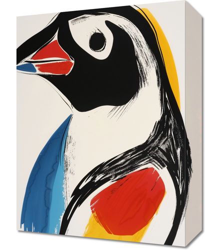 Obraz z serii abstrakcja zatytułowany Portret Ptaka. Prezentuje on stylizowany obraz ptaka, być może maskonura, z charakterystycznym dużym okiem i kolorowym dziobem. Artysta użył odważnych, geometrycznych kształtów i intensywnych barw, aby uchwycić esencję ptaka w prosty, ale wpadający w oko sposób. Duże bloki czerni, błękitu, czerwieni i żółci są zastosowane z lekkością pociągnięć pędzla, co nadaje dziełu lekkości i dynamiki. Ten obraz jest świadectwem tego, jak minimalizm może w pełni wyrazić piękno natury, będąc jednocześnie współczesnym i śmiałym elementem w każdym wnętrzu, od domowych przestrzeni po nowoczesne biura.