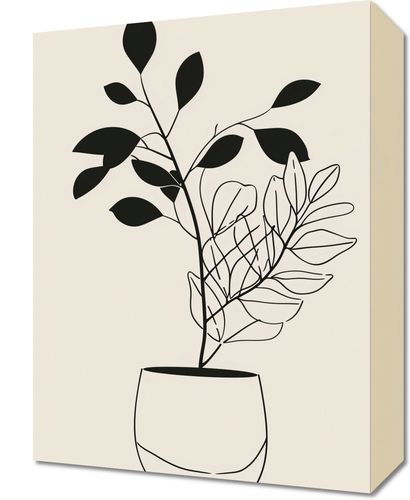 Obraz z serii minimalistyczne zatytułowany Prostota Doniczki. Obraz przedstawia elegancką kompozycję roślin w doniczce, narysowanych za pomocą czystych, prostych linii. Kontrastowe czarne liście na górze są zrównoważone przez delikatny zarys krzewu poniżej. Prosta doniczka o zaokrąglonych kształtach dodaje kompozycji nowoczesnego charakteru.Dzieło to wnoszące do wnętrza powiew świeżości i natury, jest idealnym wyborem dla przestrzeni, które cenią sobie spokój i czyste linie. Doskonale nadaje się do minimalizmu, skandynawskiego stylu mieszkania, biur, czy pokoi o jasnym wystroju, gdzie sztuka ma za zadanie uspokajać i przynosić harmonię.