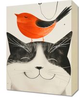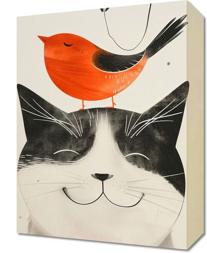 Obraz z serii abstrakcja zatytułowany Pyzaty Przyjaciel przedstawia uroczą, minimalistyczną ilustrację czarno-białego kota z zamkniętymi oczami i szerokim uśmiechem, na którego głowie spoczywa radosny, czerwony ptaszek. Kot ma charakterystyczne białe obszary wokół pyszczka, na którym wyraźnie rysują się czarne wąsy i delikatny nos. Ptaszek wydaje się być zadowolony, śpiewający, z zamkniętymi oczkami, co dodaje kompozycji wesołego i spokojnego nastroju. Tło jest jasne, z subtelnymi plamami i kropkami, które mogą imitować subtelny efekt spękanego płótna lub papieru. Po lewej stronie, na górze, widoczna jest wschodnia pieczęć, co nadaje pracy szczyptę orientalnego charakteru. Ta grafika mogłaby być idealnym, ciepłym dodatkiem do przestrzeni domowej, zwłaszcza do pokoju dziecka lub jako element dekoracyjny w przestrzeni wspólnej, przynoszący uśmiech i poczucie spokoju.