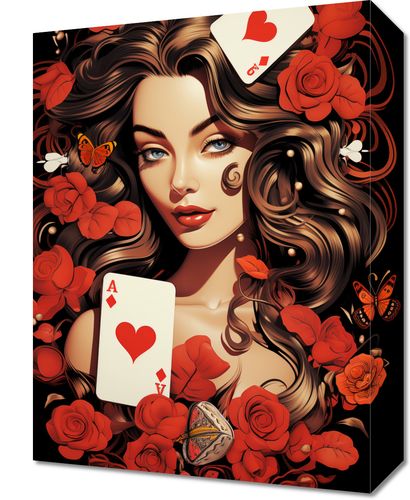 Obraz z serii abstrakcja zatytułowany Różany Hazard. Ta bogato zdobiona grafika przedstawia portret kobiety z królewskim spokojem, otoczoną przez wirujące karty z sercami i rozkwitające czerwone róże. Jej włosy płynnie przechodzą w kwiatowe motywy, a spojrzenie jest pełne tajemnicy i uroku. Motyle i drobne perełki dodają kompozycji element fantazji i delikatności. Wszystko to na tle głębokiej czerni, która eksponuje intensywność kolorów i detali. Obraz ten jest idealny dla przestrzeni, które chcą dodać element romantyzmu i wyrafinowania, jak eleganckie sypialnie, prywatne kolekcje czy luksusowe salony. Jego barwna paleta i symboliczne elementy sprawiają, że jest to dzieło, które przyciąga wzrok i pobudza wyobraźnię. BLEJTRAMABlejtrama, na którą naciągane jest płótno, wykonana jest z naturalnego drewna sosnowego. To mocne i solidne drewno stanowi jedno z najbardziej ekologicznych rozwiązań, gdyż jest łatwe w obróbce. Dodatkowym atutem jest fakt, że sosna rośnie w Polsce, co gwarantuje lokalną obróbkę materiału. Obraz na takiej blejtramie jest trwały i wytrzymały. Ramki do zdjęć nie są wliczone w cenę wydruku. Jeśli chcesz je nabyć, prosimy o dokonanie zakupu oddzielnie.ZADRUKOWANE BOKIKażdy egzemplarz charakteryzuje się zadrukowanymi bokami, co umożliwia zawieszenie obrazu na ścianie bez potrzeby dodatkowej oprawy.