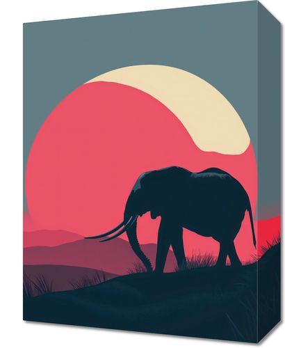 Obraz z serii wnętrza zatytułowany Słoń przy Czerwieni prezentuje majestatyczną sylwetkę słonia na tle olśniewającego, dużego, czerwonego słońca, które stanowi tło dla sceny. Ciepłe kolory zachodzącego słońca i spokojne odcienie krajobrazu przywodzą na myśl spokój i majestat natury. Sylwetka słonia, umieszczona centralnie na obrazie, w kontraście do jasnego tła, podkreśla jego imponującą posturę i spokojną siłę. Idealnie sprawdzi się w salonach, miejscach odpoczynku bądź pokojach o tematyce przyrodniczej.