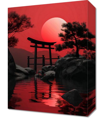 Obraz z serii motywy wschodnie zatytułowany Świątynia przy Ciszy. Ten uderzający obraz przedstawia tradycyjną japońską bramę torii w odcieniach czerwieni, która majestatycznie rysuje się na tle wschodzącego słońca. Odbicie bramy w spokojnych wodach dodaje kompozycji głębi i symbolizuje harmonię między człowiekiem a naturą. Czerwone i czarne kontrasty są zarówno odważne, jak i kojące, czyniąc ten obraz idealnym akcentem do wnętrz o minimalistycznym charakterze lub jako punkt skupienia w przestrzeniach medytacyjnych i spokojnych kącikach domowych.