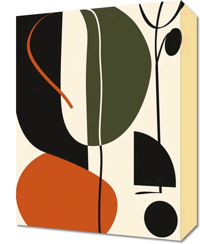 Obraz z serii minimalistyczne zatytułowany Symfonia Graweru. Grafika charakteryzuje się odważnym połączeniem abstrakcyjnych form i linii, które razem tworzą złożoną i intrygującą kompozycję. W palecie barw znajdują się głęboka czerń, spokojna oliwka, energiczna pomarańcza i stonowane beże, które nadają dziełu wyrafinowany, ale dynamiczny charakter. Kontrastowe kształty i płynne linie sugerują ruch i harmonię, mogące reprezentować muzykalność lub wewnętrzne połączenia. Ten obraz idealnie wpasuje się w nowoczesne, minimalistyczne wnętrza, które doceniają sztukę abstrakcyjną jako sposób wyrażania emocji i twórczej energii. Idealny do salonów, przestrzeni kreatywnych lub biurowych, wprowadzając do nich element unikatowego designu.
