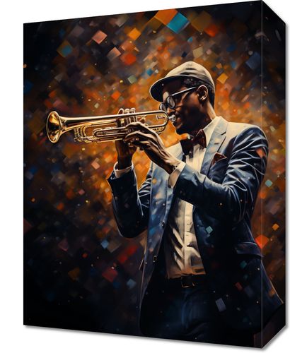Obraz z serii pop art zatytułowany Symfonia na Trąbce. Na dziele przedstawiony jest elegancko ubrany muzyk jazzowy, zagłębiony w grze na trąbce. Postać otacza kalejdoskop ciepłych, żywych barw, które pulsują w rytmie nieuchwytnej melodii. Detale takie jak błyszcząca trąbka, stylowy kapelusz i charakterystyczne okulary podkreślają indywidualność i pasję artysty. To dzieło celebruje muzykę i jej zdolność do wyrażania głębokich emocji, idealnie nadając się do wnętrz miłośników muzyki, jazzowych klubów oraz przestrzeni artystycznych, gdzie może dodać atmosfery i inspiracji.