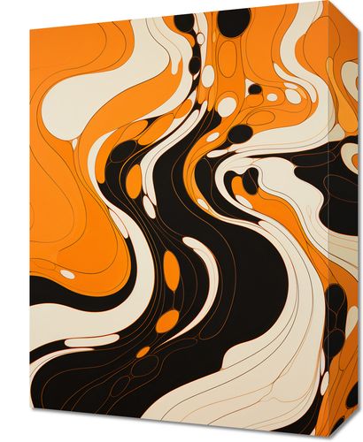 Obraz z serii abstrakcja zatytułowany Tańczący Atrament. Hipnotyzujące fale i krople w tonacjach pomarańczu, bieli i czerni tworzą efekt płynącej cieczy, przypominającą rytmiczny taniec kropli atramentu na papierze. Ciemne elementy wtapiają się w jasne, tworząc harmonijne przejścia i wzory pełne życia. Kontrastujące barwy i kształty dodają obrazowi głębi i dynamiki, intrygując i prowadząc wzrok od jednego elementu do drugiego. Doskonały dla nowoczesnych galerii sztuki, przestrzeni biurowych lub domowych salonów, które chcą dodać swoim wnętrzom nieco abstrakcyjnej elegancji.