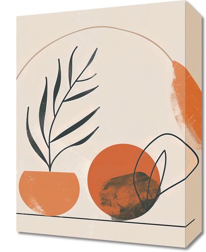 Obraz z serii boho zatytułowany Tonacja Pasteli. Obraz przedstawia harmonijną kompozycję elementów natury i abstrakcyjnych kształtów. Widzimy doniczkę z delikatną rośliną o czarnych, smukłych liściach, które delikatnie kontrastują z ciepłym odcieniem pomarańczy naczynia. Towarzyszą jej geometryczne formy: dwa krągłe kształty w tonacji ziemi, które przeplatają się, tworząc iluzję przestrzeni i głębi. Rysunek uzupełnia subtelna linia horyzontu i rozproszone kropki, dodające plakatowi dynamiki. Idealnie sprawdzi się jako element dekoracyjny w pomieszczeniach, gdzie dominuje spokój i równowaga, takich jak jasne, przestronne salony, pokoje do medytacji lub ciche zakątki bibliotek.