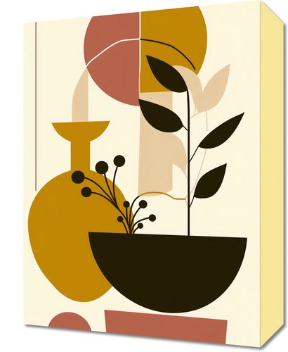 Obraz z serii minimalistyczne zatytułowany Wielkość Natury. Zaprezentowana jest tutaj elegancka kompozycja roślin w prostym naczyniu, zestawiona z geometrycznymi blokami kolorów w ciepłej, naturalnej palecie. Przywodzi ona na myśl harmonię i zorganizowaną prostotę, które można znaleźć w naturze, jak również w ludzkich tworach. Elementy w kształcie koła i półkola nadają kompozycji spokoju i równowagi, a linie i bloki kolorów tworzą poczucie głębi i struktury. Ten obraz będzie idealny do wnętrz, gdzie ceni się porządek i minimalistyczne podejście do dekoracji, wnosząc jednocześnie elementy natury i spokoju. Idealny do umieszczenia w przestrzeniach takich jak nowoczesne salony, eleganckie gabinety, lub jako spokojne tło w przestrzeniach biurowych.