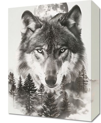 Obraz z serii natura zatytułowany Wilczy Duch Lasu przedstawia majestatyczną głowę wilka, której intensywne, przenikliwe oczy wydają się patrzeć prosto w duszę widza. Tło w odcieniach bieli i szarości tworzy iluzję mgły, która otula sylwetki drzew i zarysy gór. Ponad wilkiem unosi się pełnia księżyca, która rozświetla nocne niebo, dodając kompozycji tajemniczego i mistycznego charakteru. Ten obraz idealnie wpasuje się w przestrzeń miłośnika natury, wzbogacając każde pomieszczenie o element dzikiego i surowego piękna. Dzięki swojej symbolicznej sile i głębi będzie nie tylko dekoracją, ale również źródłem inspiracji i kontemplacji. Idealnie sprawdzi się w salonach, przestrzeniach wspólnych, bibliotekach, a także jako punkt centralny w galerii sztuki czy prywatnym biurze.