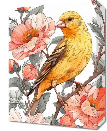 Obraz z serii natura zatytułowany Wiosenny Śpiewaczek przedstawia pełną detali i życia scenę, w której jaskrawo żółty ptak, przypominający kanarka, spoczywa na gałęzi wśród kwitnących kwiatów. Delikatne i subtelne kolory kwiatów w pastelowych odcieniach różu i pomarańczu tworzą miękki kontrast do żywego upierzenia ptaka. Precyzyjne linie i staranne cieniowanie nadają ilustracji realistycznego wyglądu, a roślinność w tle jest równie szczegółowo wykonana, co dodaje kompozycji głębi i bogactwa. Ten obraz to celebracja wiosennego odrodzenia i piękna natury, idealny do ożywienia każdego wnętrza, szczególnie pokoju dziennego, przestrzeni odpoczynkowej lub kawiarni o przytulnej atmosferze.