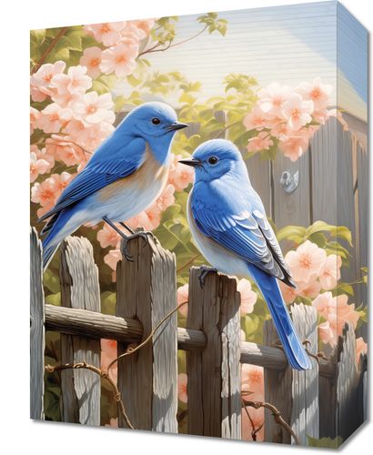 Obraz z serii natura zatytułowany Wiosna u Bram to zachwycająca ilustracja, przedstawiająca dwa błękitne ptaki, które wydają się prowadzić spokojną rozmowę, siedząc na starym drewnianym płocie. Tło kompozycji zdobią delikatne, różowe kwiaty, które tworzą romantyczny i spokojny nastrój. Subtelne światło przenika przez liście, delikatnie rozświetlając scenę i podkreślając intensywny błękit upierzenia ptaków, co przyciąga wzrok i budzi ciepłe uczucia. Ten obraz sprawdzi się jako element dekoracyjny w każdym pomieszczeniu, wprowadzając atmosferę wiosennej świeżości i naturalnego piękna. Idealny dla miłośników przyrody i delikatnej, artystycznej ekspresji.