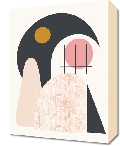 Obraz z serii boho zatytułowany Zakres Widoku.Obraz przedstawia abstrakcyjną kompozycję łączącą kształty zakrzywione i geometryczne, wykorzystującą miękką i spójną paletę kolorów. Dominujące kolory to czarny, odcienie różu, beż oraz akcent żółtego, tworząc poczucie równowagi i nowoczesnej estetyki. Kompozycja składa się z nakładających się form, w tym dużej czarnej figury z wycięciem koła, przez które prześwituje część różowego koła, oraz żółtego koła umieszczonego w obszarze czarnym, co może sugerować ciało niebieskie typu księżyc lub słońce. Obecne są również elementy fakturalne, dodające głębi i intrygi jednemu z kształtów, a proste linie przecinają różowe koło, przyczyniając się do wizualnego zainteresowania dziełem. Całość kompozycji przekazuje spokojne i współczesne wrażenie, prawdopodobnie czerpiąc inspirację z natury i sztuki abstrakcyjnej.