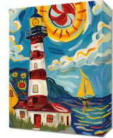 Obraz z serii abstrakcja zatytułowany Żywa Przystań to wesoła i barwna ilustracja przedstawiająca latarnię morską w nadmorskim pejzażu. Wyraziste, kręte linie i żywe kolory nadają scenie energii i ruchu, a dynamiczne słońce z żaglówką na tle morskich fal tworzy optymistyczny obraz. Latarnia morska, z jej klasycznymi czerwono-białymi pasami, stoi dumnie obok uroczego żółtego domku, a całość jest otoczona przez stylizowane kwiaty i roślinność. Styl przypomina ekspresjonistyczne dzieła z początku XX wieku, pełne życia i radości. Ten obraz jest idealny do rozjaśnienia każdego pomieszczenia, nadając mu ciepła i pozytywnej energii, świetnie sprawdzi się w przestrzeniach takich jak salony, pokoje dziecięce czy miejsca publiczne, gdzie może wprowadzić atmosferę spokoju i radosnego spędzania czasu.