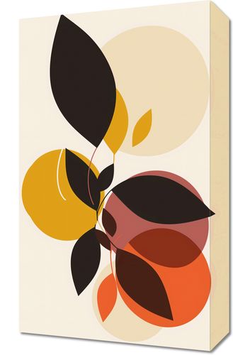 Obraz z serii minimalistyczne zatytułowany Brzask Złota.Ta grafika cechuje się prostotą form i bogactwem barw. Kontrastujące kształty liści na tle stonowanych kół tworzą harmonijną całość, która może być interpretowana jako metafora równowagi w przyrodzie. Ciepłe kolory żółci i pomarańczy przenikają się z głębokimi odcieniami brązu, co może sugerować zmianę sezonów lub cykl życia. Stylizacja ta przypomina o spokojnym, lecz żywym rytmie natury i mogłaby doskonale wpasować się w przestrzeń domową jako element dekoracyjny, niosący ze sobą spokój i refleksyjność.