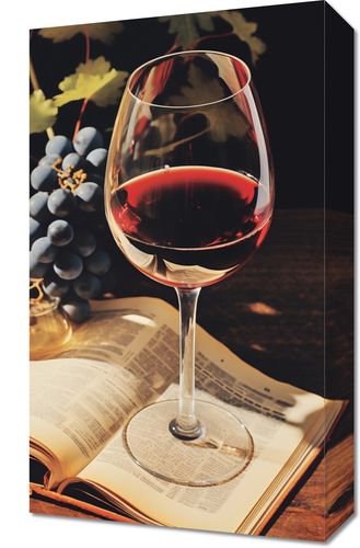 Obraz z serii wnętrza zatytułowany Bukiet Historii. Na tej zachęcającej ilustracji widzimy kieliszek czerwonego wina delikatnie spoczywający na otwartej stronie książki, z wyraźnym odbiciem na stronach. Obok kieliszka umieszczono grono dojrzałych winogron, a całość kompozycji znajduje się na ciemnym tle, co podkreśla bogactwo i głębię barw. Ten obraz oddaje przyjemność płynącą z połączenia relaksującej lektury z degustacją wybornego wina, idealny dla miłośników dobrych książek i enologii, świetnie sprawdzi się w domowych biblioteczkach, salonach degustacyjnych czy jako wyrafinowana dekoracja w winiarniach.