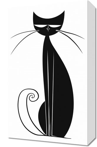 Obraz z serii abstrakcja zatytułowany Czerń Kocicy. Przedstawia minimalistyczną, stylizowaną ilustrację czarnego kota. Postać kota charakteryzuje się wydłużonym, smukłym ciałem z długimi, subtelnymi liniami, które tworzą elegancką i uproszczoną formę. Kot posiada duże, wyraziste oczy i długie wąsy, które dodają mu charakteru, a zakrzywiony ogon w kształcie spirali dodaje dynamiki kompozycji. Całość jest utrzymana w czarno-białej kolorystyce, co nadaje projektowi nowoczesnego i wyrafinowanego wyglądu. Obraz ten idealnie sprawdzi się jako dekoracja w nowoczesnych wnętrzach, wprowadzając element zaskakującej prostoty i elegancji.