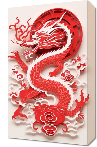 Obraz z serii motywy wschodnie zatytułowany Czerwony Smok. Ta intrygująca grafika przedstawia czerwonego smoka w stylu papierowej wycinanki, który wydaje się wyłaniać z tła z potężną siłą i gracja. Smok, symbolizujący szczęście, siłę i dobrobyt w kulturach azjatyckich, został przedstawiony w pełnym ruchu, z płomieniami i chmurami otaczającymi jego ciało. Kolor czerwony dominuje w dziele, co w kulturze chińskiej jest zwiastunem szczęścia i pomyślności. Ten obraz doskonale nada się jako wyraziste dzieło sztuki w każdym wnętrzu, szczególnie polecany jako dekoracja na święto Chińskiego Nowego Roku, w przestrzeniach publicznych takich jak restauracje czy hotele, a także w domach ceniących azjatycką estetykę i symbolikę.