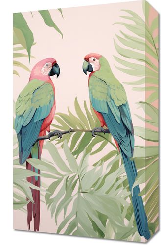 Obraz z serii wnętrza zatytułowany Dialog Ara. Na tej jasnej i pełnej życia ilustracji widzimy dwie papugi ary, które z gracją spoczywają na gałęzi, otoczone tropikalnymi liśćmi palm. Ich wyraziste, kolorowe upierzenie w odcieniach różu, zielonego i błękitu przyciąga wzrok i wprowadza egzotyczną atmosferę do każdej przestrzeni. Obraz ten jest idealnym wyborem dla miłośników natury i kolorowych, radosnych motywów, doskonale nadaje się do wnętrz, które pragną dodać odrobinę tropikalnego ciepła, takich jak jasne salony, dziecięce pokoje, a także jako dekoracja w kawiarniach i restauracjach o egzotycznym charakterze.