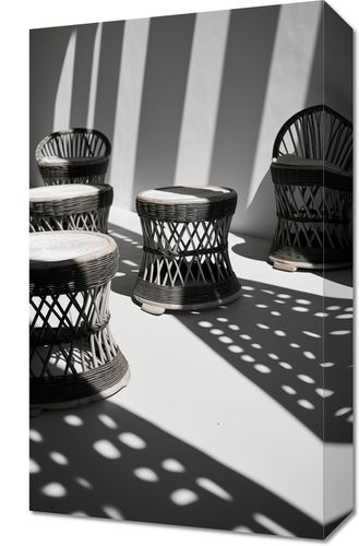 Obraz z serii wnętrza zatytułowany Gra Świateł to stylowa, monochromatyczna fotografia, która oddaje estetykę współczesnego designu. Na fotografii widzimy zestaw eleganckich, plecionych stołków z rattanu ustawionych na tle geometrycznych cieni. Ostre linie cieni przełamują okrągłe kształty mebli, tworząc fascynującą kompozycję pełną kontrastów. Białe siedziska stołków pięknie kontrastują z ciemniejszymi elementami, a gra światła i cienia nadaje scenie trójwymiarowość i teksturę. Obraz ten będzie doskonały dla miłośników minimalistycznych wnętrz, a także dla osób poszukujących elementu dekoracyjnego, który wprowadzi do pomieszczenia nowoczesny i artystyczny akcent. Idealny do nowoczesnych przestrzeni mieszkalnych, biur, kawiarni lub galerii sztuki.