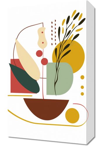 Obraz z serii minimalistyczne zatytułowany Harmonia Natury Martwej. Grafika ta to nowoczesna interpretacja klasycznego motywu natury martwej, gdzie geometryczne formy łączą się z delikatnymi roślinnymi akcentami. Paleta barw jest ciepła i ziemista, z akcentami głębokiego czerwieni, spokojnych zieleni i musztardowych żółci, wszystkie umieszczone na jasnym tle, co nadaje pracy subtelność i lekkość.Ten obraz świetnie komponuje się z wnętrzami, które cenią sobie spokój i równowagę, a także z przestrzeniami, które chcą wnieść do swojego otoczenia sztukę inspirowaną naturą. Może być wyjątkowym dodatkiem do salonu, przestrzeni relaksacyjnej, czy jako estetyczny akcent w jadalni.