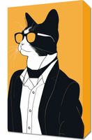 Obraz z serii abstrakcja zatytułowany Jegomość to stylizowany portret kota w ludzkim ubiorze. Charakterystyczne, czarno-białe ubarwienie kota zostało podkreślone przez elegancki, czarny garnitur z białą koszulą oraz modnymi, żółtymi okularami, które dodają postaci wyrafinowanego uroku. Tło w intensywnym odcieniu musztardy idealnie komponuje się z całością, nadając plakatowi ciepły i wyrazisty charakter. Silny profil kota, wyraźne linie i minimalistyczne podejście do szczegółów czynią ten obraz zarówno zabawnym, jak i eleganckim, idealnym do przestrzeni, które cenią sobie humor i styl, takich jak nowoczesne biura, domowe biblioteki czy saloniki.