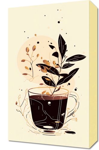 Obraz z serii minimalistyczne zatytułowany Jesienna Donica. Na obrazie widzimy czarną filiżankę pełną aromatycznej kawy, z której wyłania się roślinność w barwach jesieni. Tło w pastelowych beżach i brązach tworzy przytulną atmosferę, a drobne kropki i plamy nadają kompozycji dynamiki. Grafika oddaje ciepło i przytulność chłodniejszych dni, zapraszając do delektowania się chwilą w spokoju domowego zacisza. Idealny do wnętrz, które cenią sobie ciepłe akcenty i klimatyczne detale, pasuje do kawiarni, kuchni, lub jako element relaksującej przestrzeni w salonie.