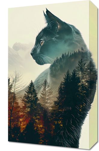 Obraz z serii natura zatytułowany Koci Duch Lasu. Ten obraz prezentuje zaskakującą kompozycję, w której sylwetka czarnego kota płynnie przechodzi w mglisty krajobraz leśny, łącząc świat zwierzęcia z dziką przyrodą. Złote i ciepłe odcienie jesiennego lasu w tle kontrastują z chłodnymi tonami gór, dodając głębi i tajemniczości. Mistyczne połączenie kota z naturą symbolizuje jedność i harmonię między żywymi istotami a otoczeniem, a także podkreśla dziką i niezależną naturę kota. Obraz idealnie nadaje się do przestrzeni mieszkalnych ceniących połączenie sztuki z naturą, takich jak nowoczesne salony, pokoje relaksacyjne lub gabinety, jak również może być inspirującym elementem dekoracyjnym dla gabinetów weterynaryjnych lub przychodni zoologicznych.