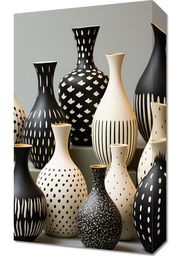 Obraz z serii wnętrza zatytułowany Kontrast i Harmonia. Eleganckie wazony w subtelnych odcieniach bieli i intensywnej czerni stoją dumnie na szarości tła. Geometryczne i abstrakcyjne wzory, które zdobią te wazony, przypominają tętniącą życiem tańczącą symfonię. Kropki, linie i formy tworzą intrygującą kompozycję, która przyciąga wzrok i dodaje wnętrzom wyjątkowej głębi. Subtelna gra świateł i cieni, a także kontrast między monochromatycznymi barwami, dodaje tej kolekcji odrobinę tajemniczości. Będzie to idealne dopełnienie zarówno dla nowoczesnych przestrzeni loftowych, jak i eleganckich salonów z naciskiem na design. Ten wyjątkowy plakat doskonale odnajdzie się w galeriach sztuki oraz w luksusowych hotelach.