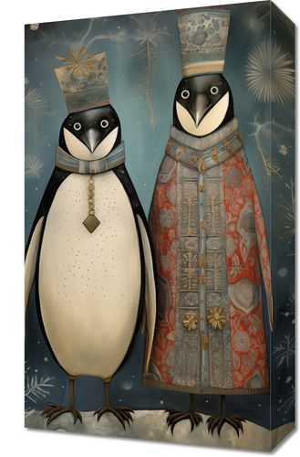 Obraz z serii wnętrza zatytułowany Królewskie Pingwiny. Ta ilustracja przedstawia parę pingwinów ubranych w bogato zdobione, królewskie szaty, które nadają im wygląd postaci z baśni lub z dawnych legend. Ich wytworne stroje, wypełnione drobnymi detalami i ornamentami, kontrastują z prostym tłem, które przywodzi na myśl zimowy, śnieżny pejzaż. Obraz ten wprowadza do wnętrza element kaprysu i elegancji, będąc idealnym wyborem dla przestrzeni pełnych fantazji, takich jak pokoje dziecięce, przestrzenie kreatywne, lub jako oryginalny akcent dekoracyjny dla miłośników nietuzinkowych i zabawnych dzieł sztuki.