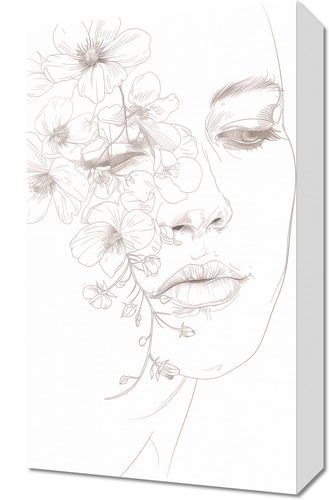 Obraz z serii wnętrza zatytułowany Kwitnąca Imersja przedstawia delikatny, linijny rysunek profilu kobiety, którego twarz częściowo zasłaniają i uzupełniają subtelne kwiaty. Delikatne linie twarzy kobiecej harmonizują z organicznymi kształtami roślin, sugerując jedność z naturą i subtelne piękno. Kwiaty wydają się być naturalnym przedłużeniem jej bytu, dodającym delikatności i eterycznego charakteru całej kompozycji. Ta minimalistyczna, ale wyrafinowana ilustracja emanuje spokojem i ukojeniem, idealna do przestrzeni medytacyjnych, salonów spa, lub jako elegancki element dekoracyjny w nowoczesnych wnętrzach.