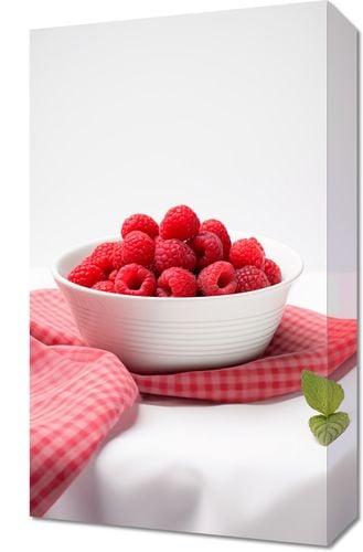 Obraz z serii wnętrza zatytułowany Lato w Misce. Na obrazie widnieje pełna misa soczystych, dojrzałych malin, które kontrastują swoją intensywną czerwienią z czystą bielą naczynia i tłem. Rozłożona obok misy czerwono-biała, kratka serwetka dodaje wiejskiego uroku, a pojedynczy listek mięty wprowadza świeży akcent. Ten obraz przyciąga wzrok swoją prostotą i elegancją, idealnie uchwycając esencję letniego sezonu i świeżości owoców. Doskonały do ożywienia kuchni, jadalni, a także jako element dekoracyjny w przestrzeniach, gdzie chce się wprowadzić nutę świeżości i naturalnego piękna. Zaprasza do celebracji zdrowego stylu życia i radości płynącej z prostych przyjemności.