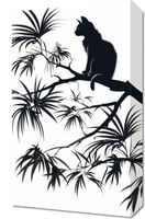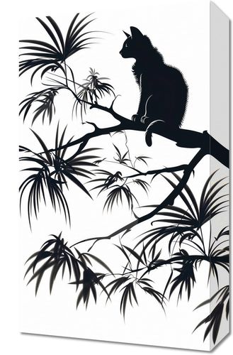 Obraz z serii wnętrza zatytułowany Na Gałęzi przedstawia sylwetkę kota siedzącego na gałęzi, zarysowaną na tle jasnego, jednolitego tła. Całość kompozycji utrzymana jest w stylu sumi-e, nawiązującym do tradycyjnej wschodniej techniki tuszem. Kontury kota i roślin są wyraziste, z delikatnymi szczegółami, które przywodzą na myśl efekt cieniowania i głębi. W tle roślinność, prawdopodobnie bambus lub tropikalne palmy, jest przedstawiona w sposób stonowany, co wskazuje na użycie gradientu cieni. Grafika ta oddaje spokój i harmonię, charakterystyczne dla azjatyckiej estetyki i sztuki. Idealnie nadawałaby się jako dekoracja w przestrzeniach inspirowanych minimalizmem i naturą.