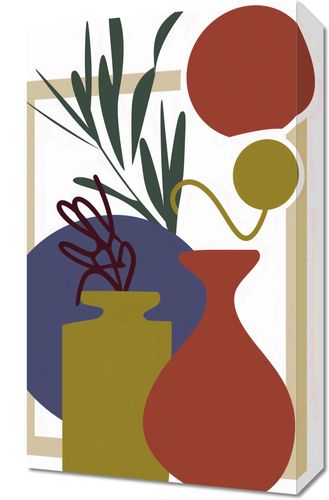 Obraz z serii minimalistyczne zatytułowany Natury Martwe. Ta kompozycja artystyczna zanurza tradycyjny motyw natury martwej w nowoczesnym, geometrycznym stylu. Różnorodne formy waz w żywych kolorach kontrastują z delikatnymi odcieniami zielonych liści, tworząc równowagę między prostotą a bogactwem form. Elementy te łączą się, tworząc elegancką i stylową całość.Ten obraz będzie wyjątkowym dodatkiem do każdego wnętrza, od klasycznie urządzonych po współczesne. Jego stonowane barwy i geometryczne kształty doskonale nadadzą się do przestronnych salonów, jadalni czy nowoczesnych biur. Jest to idealne dzieło dla tych, którzy cenią harmonię i chcą dodać do swojej przestrzeni szczyptę elegancji.