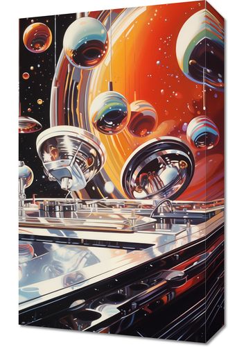 Obraz z serii pop art zatytułowany Orkiestra Sfer. Przedstawia futurystyczną symfonię kosmicznych stacji i satelitów, które unoszą się w przestrzeni wśród majestatycznych planet i wszechogarniających gwiazd. Bogate w detale, błyszczące konstrukcje odbijają się w lustrzanych powierzchniach, tworząc hipnotyzujące wzory świetlne, które przenoszą widza w odległy wymiar. Dynamiczna perspektywa i żywe kolory sprawiają, że obraz jest prawdziwym świadectwem ludzkiej wyobraźni i dążenia do odkrywania nieznanego. To dzieło doskonale nadaje się do nowoczesnych przestrzeni takich jak biura technologicznych firm, centra nauki, a także jako inspirujący element dla domowych biur i pokojów zabaw.