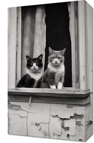 Obraz z serii wnętrza zatytułowany Para w Oknie. Uchwycenie momentu, w którym dwa koty o spokojnych i pełnych godności spojrzeniach pozują w oknie zaniedbanej fasady. Czarno-białe tło fotografii dodatkowo wzmacnia ich wyraziste, charakterystyczne wzory na sierści. Ten obraz to nie tylko urokliwa scena z życia miejskich kotów, ale również piękna metafora o spokoju i zgodzie, jaką można odnaleźć w najprostszych momentach codzienności. Obraz ten będzie wyjątkowym dodatkiem do każdego wnętrza, szczególnie polecany dla miłośników zwierząt i estetyki vintage, a także jako element ozdobny w kawiarniach czy księgarniach, który wnosi element ciepła i domowego klimatu.
