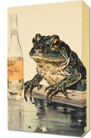 Obraz z serii motywy wschodnie zatytułowany Refleksje Błotniaka. Intrygujące spojrzenie żaby, podkreślane przez jasne, wyraziste oczy i lśniącą skórę, skontrastowane z delikatnym odbiciem w wodzie oraz subtelną butelką w tle, dodającego atmosfery spokoju i kontemplacji. Kolorowe detale butelki i intensywna zieleń żaby kontrastują z pastelowym tłem, wprowadzając do kompozycji nutę tajemniczości i głębokiego zastanowienia. Doskonale sprawdzi się w winiarniach o tematyce naturalnej oraz w przestrzeniach relaksacyjnych, takich jak salony spa czy ośrodki wellness.